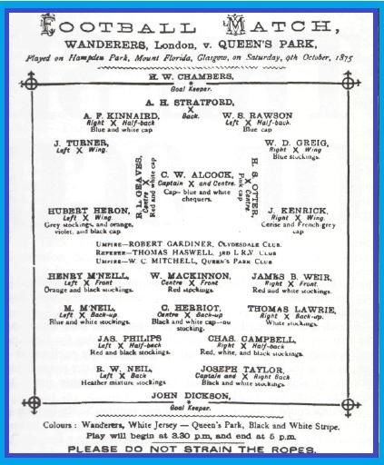 Moreover, the horizontal to vertical adjustment clearly worked, with more to come and the following implications. From these new tactics and not known passing, used in any case for two millennia in the ancient game, would rapidly emerge a, in fact THE, distinctively Scottish style of play, which can and in both parts be seen almost as quickly to be adopted by other teams; even if Queen's Park proved to be one of the most tardy. The earliest reporting of it and vertical forwards would be on 9th October 1875. It was versus The Wanderers once more and this time with both Arthur Kinnaird and Charles Alcock in the Londoners' line-up. Lawrie, in front, and Weir were on the right, McKinnon and Herriot in the middle and the McNeill brothers, Harry, a known shinty-player, and Moses, on the left. FYI Queens at home at Hampden won 5-0.