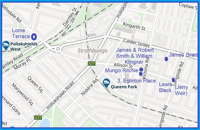 But the question in 1867 was how did the non-Highlander Ritchie hook up with the others. And the answers are probably in a part cloth and also proximity. In 1872 Lewis Black from Cullen in Banffshire via Duthhill and Grantown-on-Spey married Agnes Weir. She lived at 1, Allanton Terrace, he at no. 11. He was a Commission Merchant, a broker, presumably in cloth because a decade earlier he had been an apprentice draper in Forres and a decade later he would be an Agent in Drapery Goods. And Allanton Terrace, now 1-10 Langside Road, is 250 yards from Eglinton Terrace. Which the takes us on to the Smiths. Robinson's History of Queen's Park states that the two brothers and Klingner, lifelong friends from school at Fordyce Academy, lodged, until in late 1870 two of them headed South, at 22, Eglinton Terrace, so at the same address as Ritchie and therefore also yards from the first club gathering.
