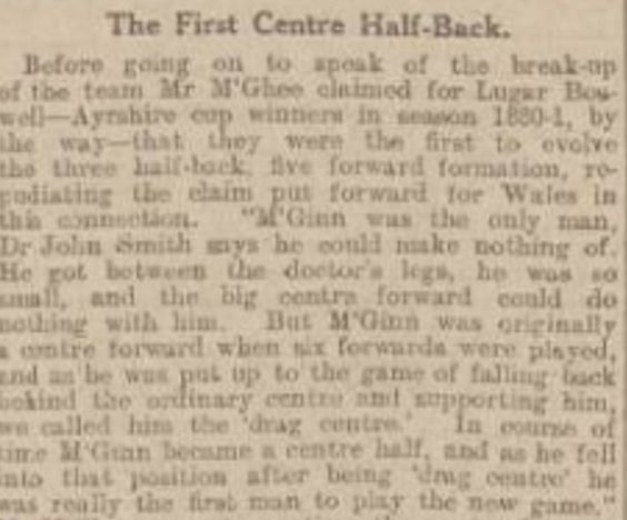 11) Again in the Vale of Leven the fundamentals of the Scottish-Game having been honed were in 1888 then augmented at Renton by the introduction of Scottish centre-half, The Pivot, essentially a fully functional mid-field, and its rapid transfer via personnel, "Scotch Professors", to wider Scotland, notably the newly created Celtic, and into England.
