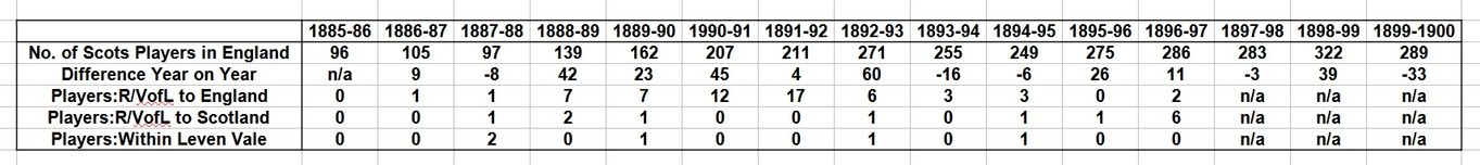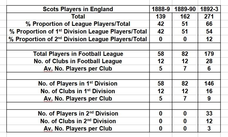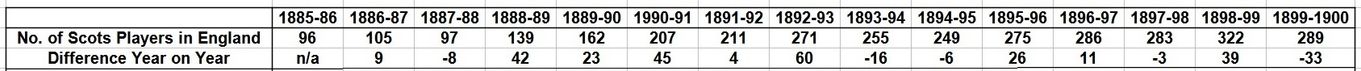 - Numbers moving South to play professionally in England, the total going from a total of just less than 100 for 1887-8 to over 200 by 1891-92, or seven per top-flight team, the Scottish national team therefore being severely weakened.