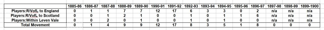 Outflows of players, both Down South and even within Scotland, of the scale experienced in the five seasons from 1889 by the two clubs, indeed three plus clubs in the Vale of Leven, because Dumbarton were not unaffected, are hardly imaginable today, although some African teams might beg to differ. The numbers speak for themselves, particularly in 1890-91 and 1891-92.