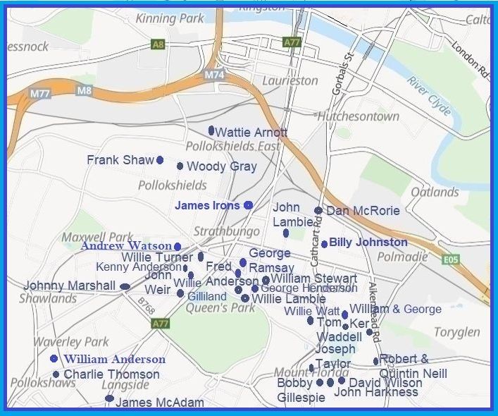 James McCall, (Alex) Currie - Iron Moulder, who moved to Greenock, Carlyle, MacAdam, Hendry, Mathieson, John McIntyre, J. Burleigh, James McBride - from Renton Wanderers, Joe Lindsay - from Dumbarton, Daniel Devine, Murray, Mackay, Harvie, (James, John or Joe) Brady, Abraham, James Kelso, Archie McCall