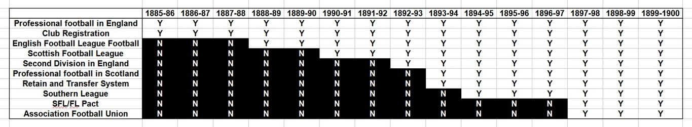 - In 1885 new anti-professionalism measures formulated by Lane Jackson introduced in England by London, objected to by Northern English clubs, which threatened schism, with London more or less backing down, the exception being annual registration, with what otherwise remained of the policy in any case again ignored.