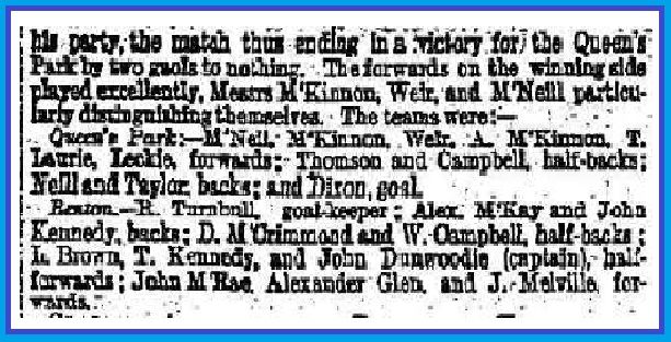 - "Assembled" Queen's Park do not agree to a postponement of the 1884 Scottish Cup Final against a Vale of Leven, "local" First Team decimated by illness. Vale of Leven withdraw