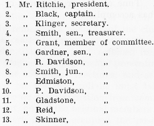 But by then most of the originators of the club had moved on in life, business and therefore from active club participation both on- and off-field. Mungo Ritchie had married in 1870, Lewis Black, as already mentioned, in 1872 with only James Grant following later in 1883. And by early 1871 both Robert Smith and James Klingner had taken themselves first to London before in 1873 the pair oce more would emigrate to North America, the latter dying in Toronto, the former in Chicago.