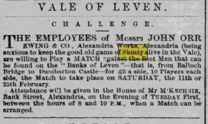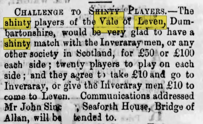 In 1870 a John Sinclair (see below) from Bridge of Allan by Stirling issued by newspaper seemingly on behalf of the players of the Vale of Leven in Dunbartonshire and to the men of Inveraray in Argyll a challenge to a shinty match with a prize of up to £100. That's £15,500 today.