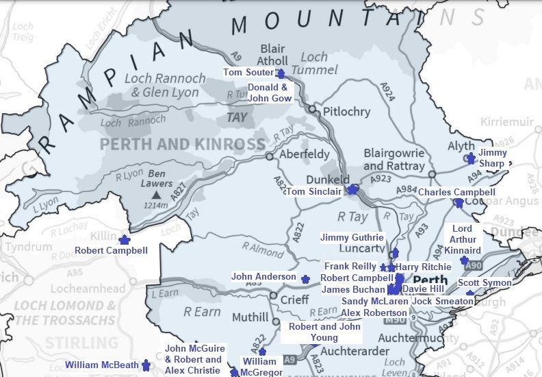 As the map below shows, in terms of players Perthshire, in particular the rural parts of the county, has produced comparatively few with the exception of the Young brothers of Auchterarder, John and notably Robert, with his fifteen year contribution at Queen's Park. And the same is true of the parts of rural Stirlingshire that border it, again with one exception and this early on with Callander the birth-place of Rangers' founder, Peter McBeath. But the same cannot be said of Dunblane and of Perth itself, perhaps a comment on opportunity rather than necessarily talent with two